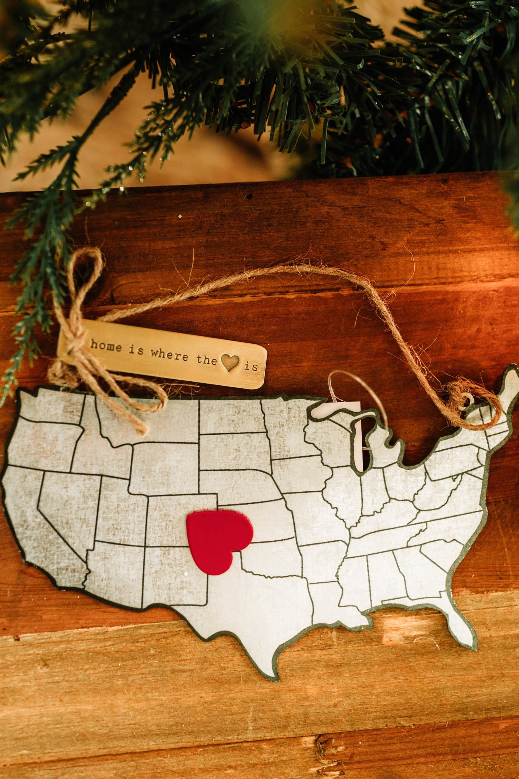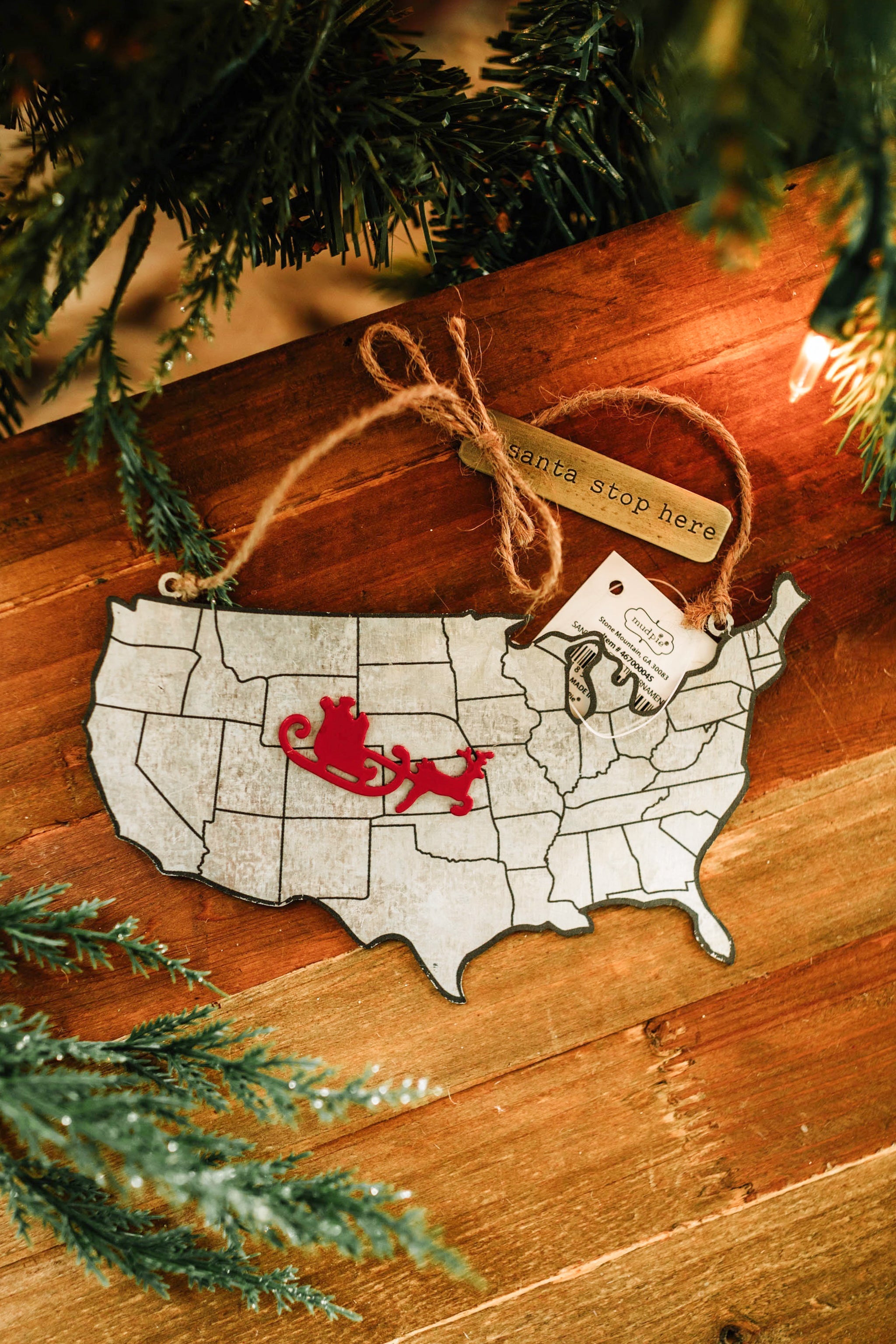 - Trim your tree in style with this galvanized tin United States shaped ornament featuring printed details, jute rope hanger and a gold metal tag with debossed Christmas themed sentiment.