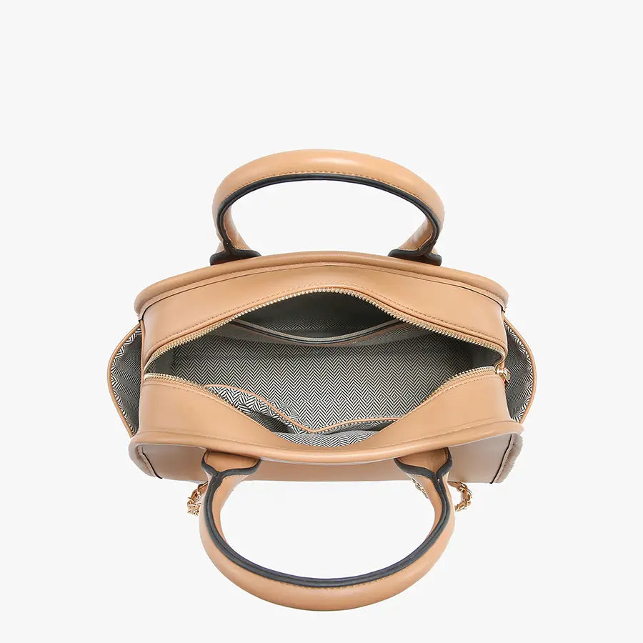 The Beth Dome Satchel w/ Chain Strap combines chic design with practical functionality. Crafted from high-quality vegan leather, this dome-shaped satchel features a sophisticated silhouette that adds a touch of elegance to any outfit.