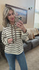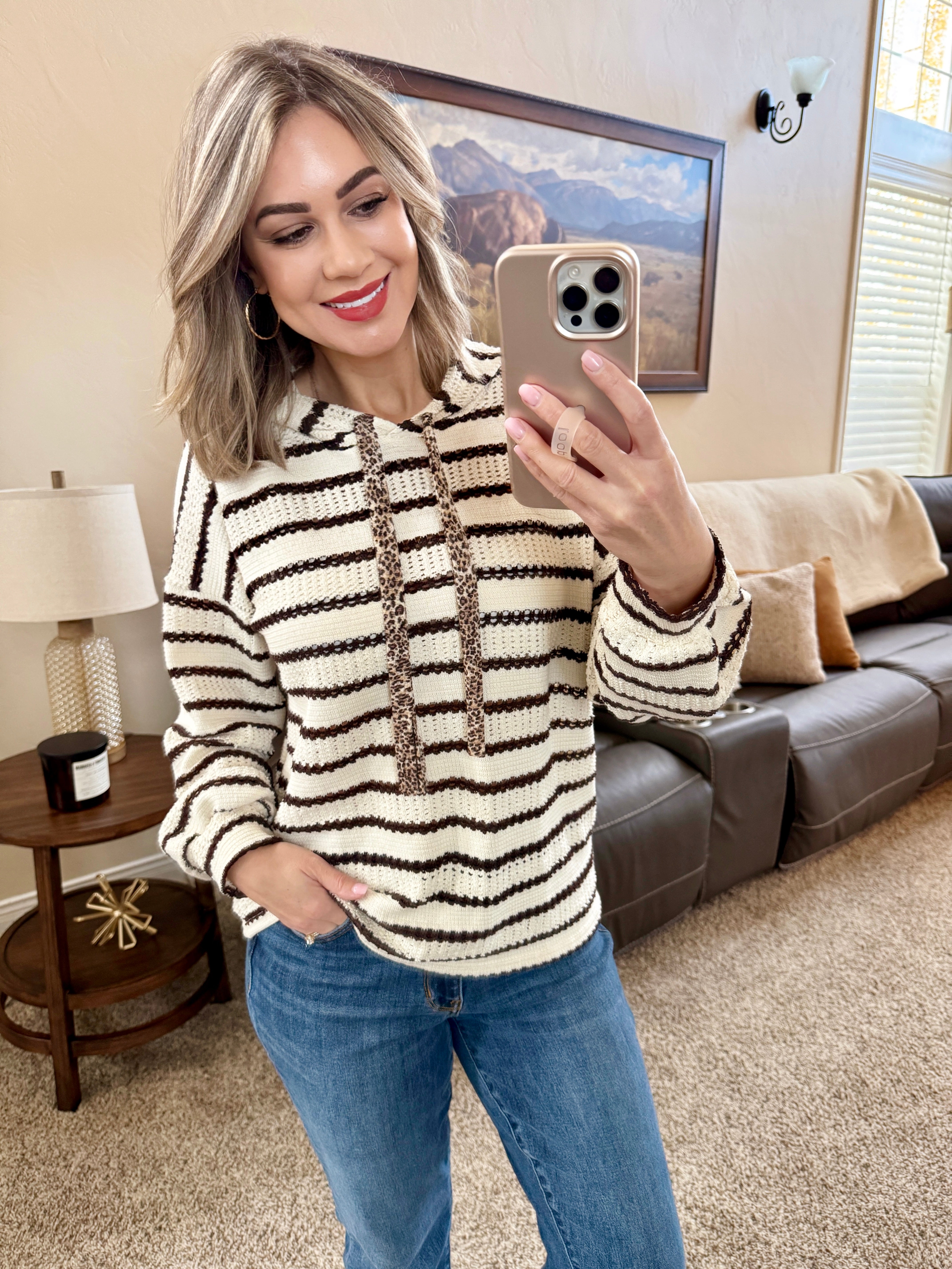 Brown Striped Drawstring Hoodie with Leopard Contrast