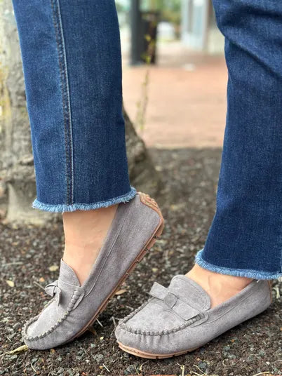 Neutral never looked so luxe. These gray suede flats are made for everyday ease with a soft, flexible fit and timeless silhouette. The cushioned sole and bow detail give comfort with a polished touch—perfect for errands, office days, or laid-back weekends.