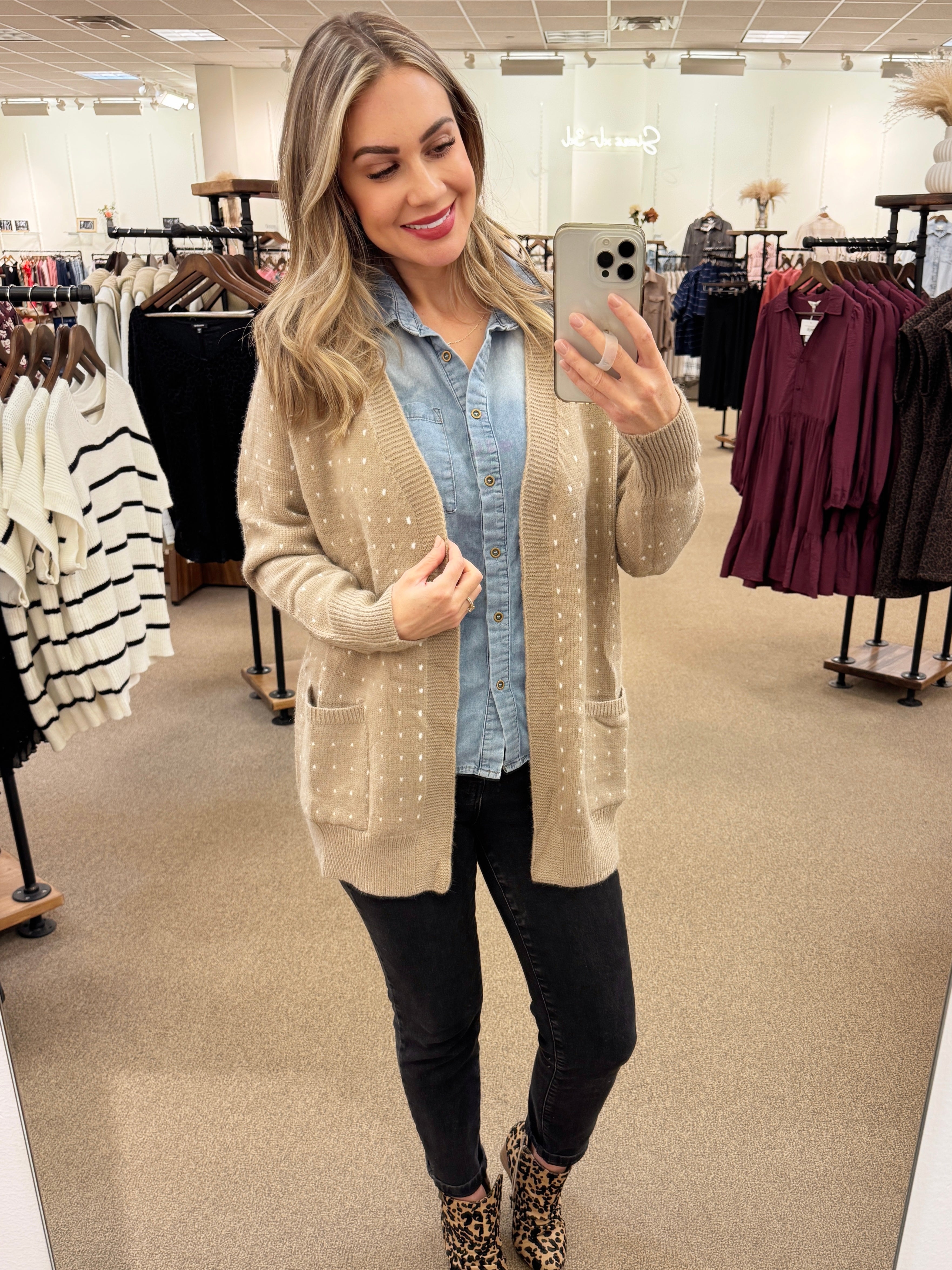 Stay cozy and stylish this Fall with our Dalilah Dot Cardigan in Tan! The neutral color and playful dots will add a touch of whimsy to any outfit, while the thicker fabric provides both warmth and comfort. Don't sacrifice style for warmth, this cardigan has it all!