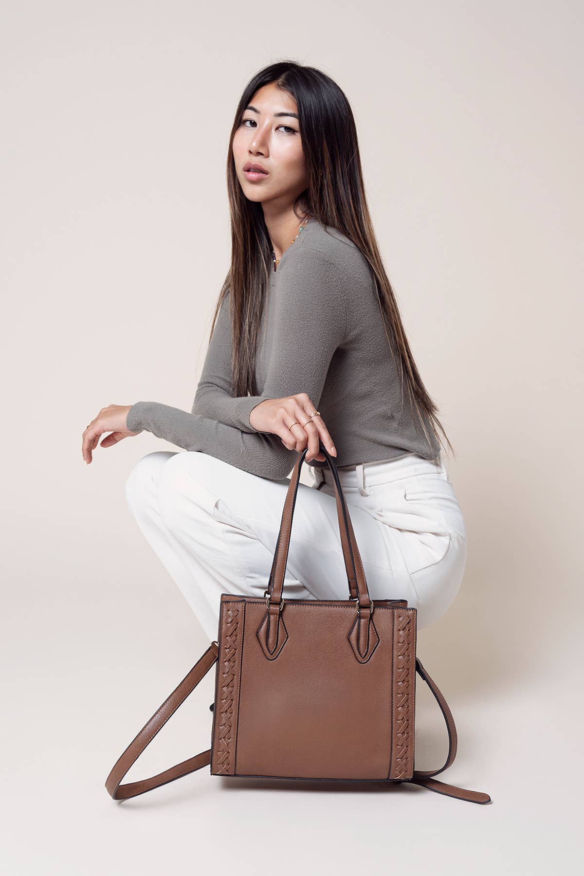 Betsy Structured Braided Crossbody/Satchel -Type: Structured crossbody/tote -Material: Vegan leather Details: -Braided side detailing -Top zipper closure -Inner bag with crossbody strap -Adjustable/removable strap -Inner slip and zip pockets -Gold-tone hardware