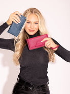 This RFID wallet is a best seller, offering both style and functionality. Crafted from vegan leather, it features card and ID slots, a zip change pocket, and a convenient wristlet strap. The snap closure ensures your belongings stay secure while on the go.