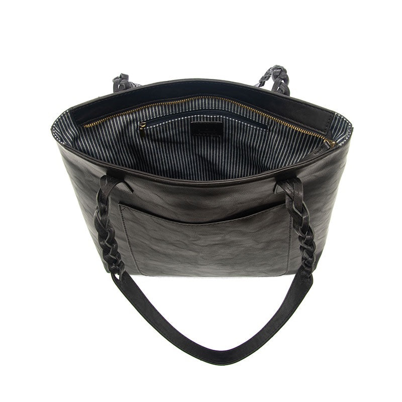 Upscale yet casual, this roomy, glossy vegan leather tote is accented with hand braided handles that will add an artisanal vibe to your professional look. A convenient front pocket allows you to quickly reach and stow your phone. The top zip closure keeps your belongings safe and secure. Inside you will find a durable striped denim lining with multiple pockets including a padded tablet/laptop pocket to keep you organized for your work week.