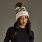 Cream & black patterned pom hat Speckled throughout Faux fur pom Fleece lined 100% Acrylic