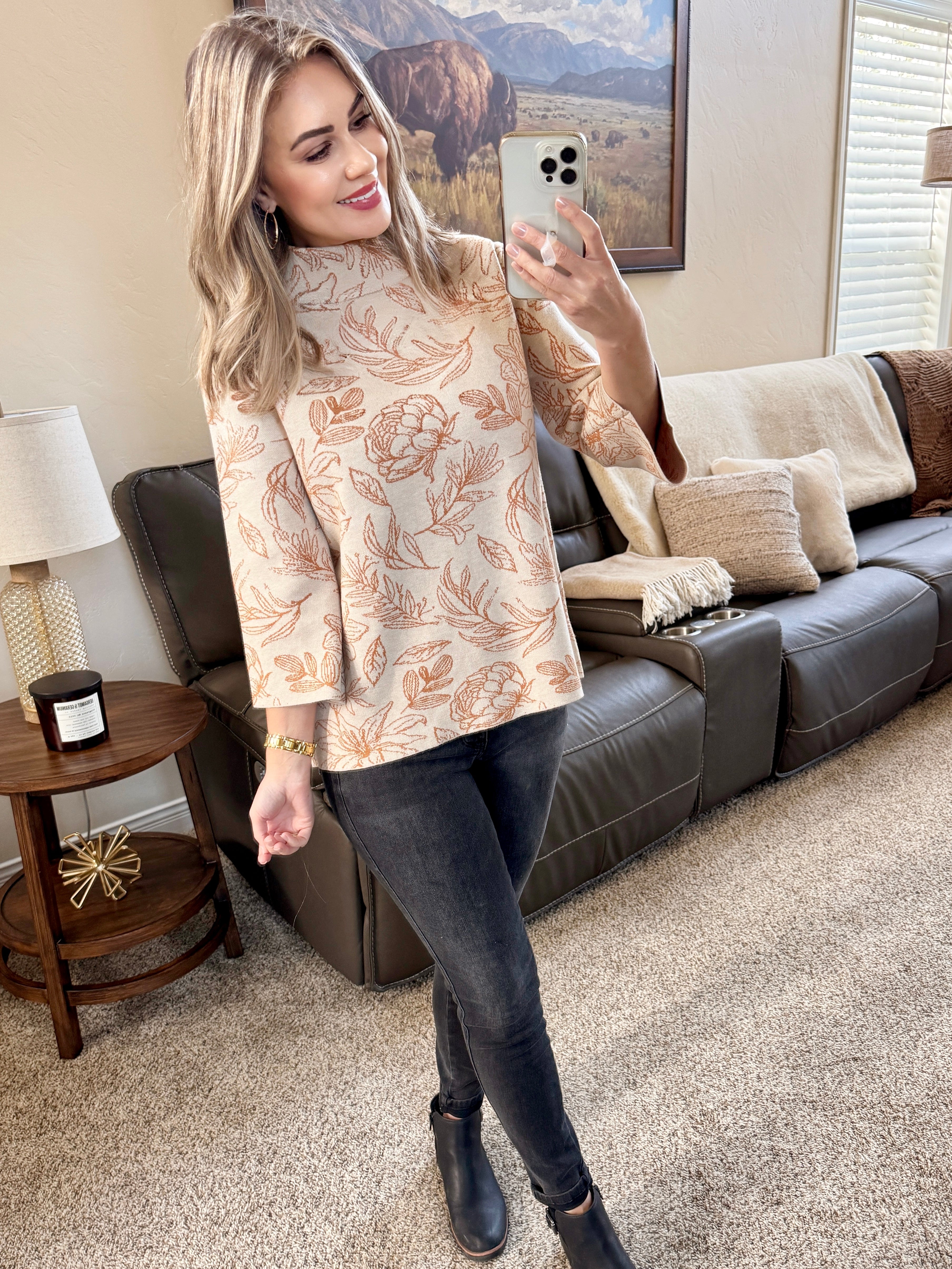 Pumpkin Floral Jacquard Mock Neck Sweater in Taupe